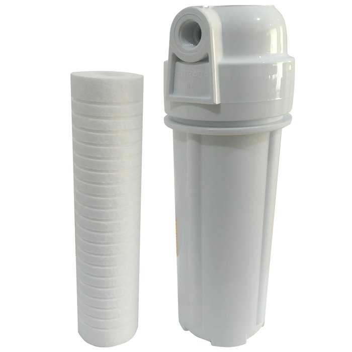 Filtro para Caixa D'Água e Cavalete PP Rosca 1/2 Qual melhor filtro para caixa d'água? Este filtro é ideal para uso residencial tendo sua instalação no Ponto de Entrada de Caixa d'água ou Cavalete para a retenção de sujeira ou partículas sólidas como areia, barro e demais sedimentos suspensos na água. Instale o filtro para cavalete em qualquer ponto após o hidrômetro e antes da caixa d'água. Dessa forma, evita-se constantes manutenções nas caixas d'água e cisternas, devido ao acúmulo de sujeira. Com água limpa, a tubulação fica protegida contra as corrosões provocadas pelo depósito da sujeira, além de evitar o entupimento de válvulas e outros equipamentos. Caso seja necessário uma maior vazão, instale os filtros em paralelo. Instale também após bombas d'água. Eficiência na redução de cloro livre, eficiência bacteriológica e controle de nível microbiológico: Não Aplicáveis. Informações técnicas: Pressão de operação: 2mca mín. a 60mca máx. Temperatura de operação: 5ºC mín. a 50ºC máx. Composição copo e tampa: Polipropileno Vazão: 1200 litros por hora. Rosca: 1/2 Filtro: Compatível com Refil 10",9"3/4 e 9"7/8 Produtos inclusos: - Filtro 10"3/4 rosca 1/2 - Refil PP 9"3/4 ranhurado encaixe