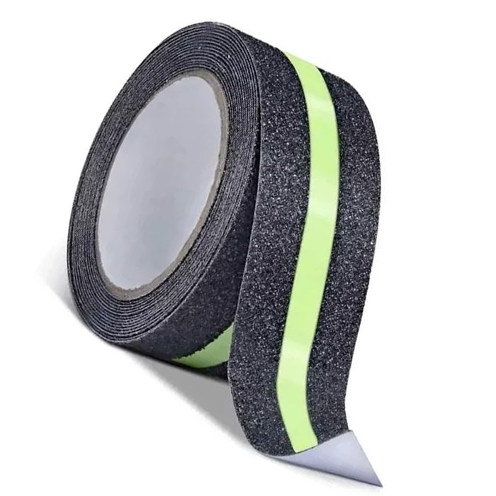 Esta fita antiderrapante preta possui uma faixa fluorescente no meio, ajudando a evitar acidentes e proporcionando maior segurança.