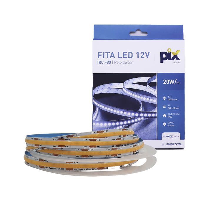Fita de Led Slim Pix 12W/M 512 Leds Cob IP20 12V Com 5 Metros 4000K Luz Neutra