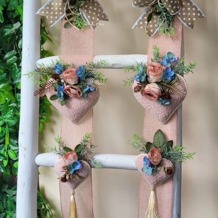 Cada ponta da fita é finalizada com laços duplos de poá, adicionando um detalhe gracioso e harmonioso à composição. Ideal para decorar portas, paredes ou até mesmo como um elemento central em eventos especiais, a Fita de Porta Corações Rosê é uma escolha perfeita para criar ambientes acolhedores e repletos de amor