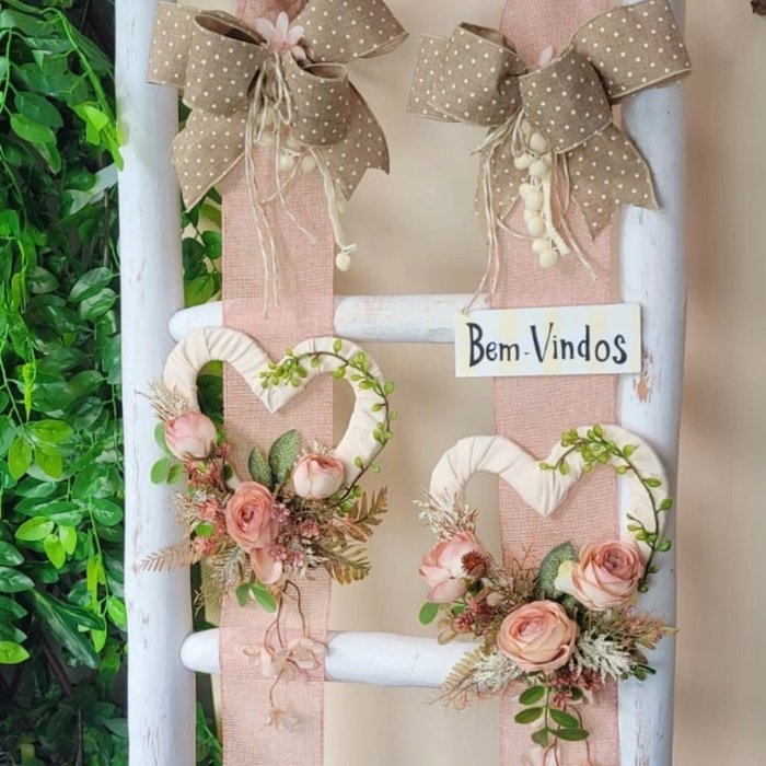 | Características Gerais - Material | Base em fita rosê aramada, com duas pequenas guirlandas em cada uma das pontas, em formato de coração, revestidas com tecido e decoradas com rosas em tons de rosa claro e verdes também claros em um dos lados com uma placa creme escrita à mão bem vindos e sobre os corações laços duplos cru com poá branco. Para acabamento nos laços e na ponta da fita, pequenos cordões de bolinhas. |