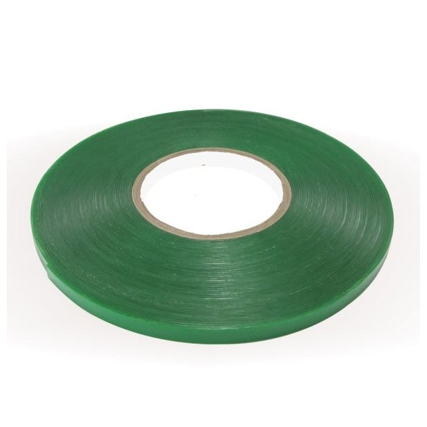 Fita Dupla Face de Massa Acrílica - transparente, com 1mm de espessura e liner verde.