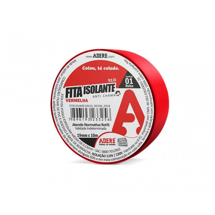 Fita Isolante Adere Colorida 19Mmx10M Vermelha * MARCA: ADERE EAN: 7896193234256 * Imagens meramente ilustrativas* - Fita Isolante Adere Colorida 19Mmx10M Vermelha * MARCA: ADERE EAN: 7896193234256 * Imagens meramente ilustrativas*