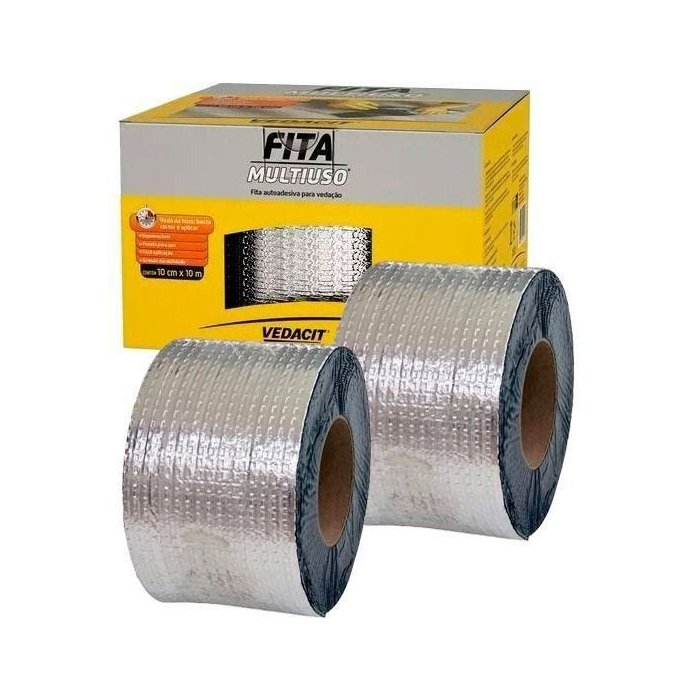 A FITA MULTIUSO AUTOADESIVA VEDACIT é uma fita asfáltica impermeável, produzida à base de asfaltos modificados com polímeros e elastômeros, que apresenta excelente aderência a vários substratos. Possui estruturante não tecido resinado de poliéster que confere maior resistência e flexibilidade. A cobertura superficial de alumínio atua como barreira refletora dos raios solares e apresenta grande durabilidade. É de fácil aplicação, sendo um modo prático, rápido e eficaz de vedar imediatamente goteiras e infiltrações.