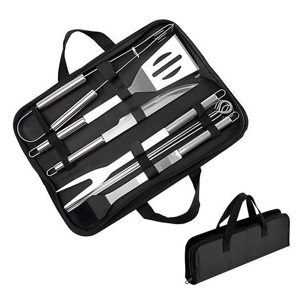 Além de funcionais, os utensílios vêm acomodados em um estojo com alça resistente e elegante, facilitando o transporte e o armazenamento, seja em casa, no sítio ou em um churrasco com amigos.