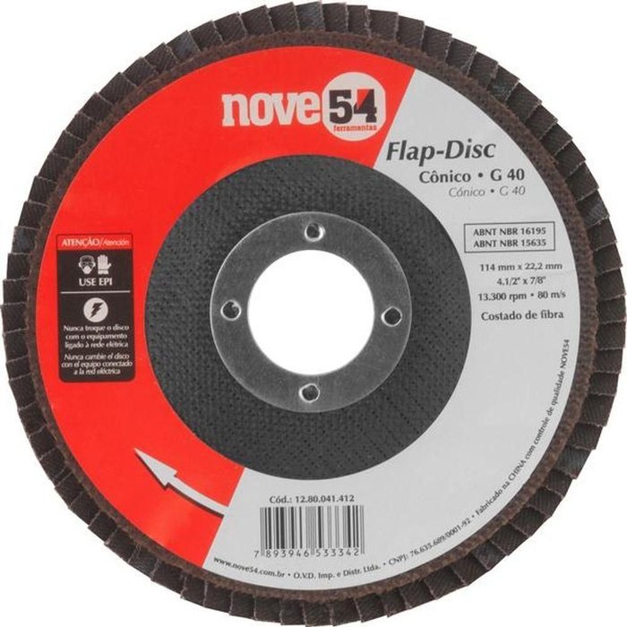 Flap-disc Cônico 4.1/2" G40 Costado Fibra - Nove54 Conteúdo da Embalagem: 1 Disco de desbaste/acabamento flap-discDescrição:Disco de desbaste/acabamento, flap-disc, cônico, 4.1/2", grão 40, costado de fibra, NOVE54 Aplicações e dicas de uso: Indicado para desbaste e acabamento em metais ferrosos e não ferrosos, como: alumínio, latão, ferro, aço, entre outros. Não indicado para aço inox. Destaques e diferenciais: Permite atividades de desbaste e acabamento ao mesmo tempo, eliminando a troca de discos. Proporciona menor vibração e ruído comparado com o disco de desbaste convencional. Seu formato cônico permite um melhor aproveitamento do disco aumentando o rendimento. Características Técnicas:Diâmetro externo do disco de desbaste/ acabamento flap-disc: 4.1/2" - 115 mmDiâmetro do furo do disco de desbaste/ acabamento flap-disc: 7/8" - 22,23 mmGrão: G 40Tipo de costado: FibraTipo do perfil do disco de desbaste/acabamento flap-disc: CônicoTipo do grão abrasivo: Óxido de alumínioRotação máxima (rpm): 13300 /minNorma de referência: ABNT NBR 15635 / ABNT NBR 16195Garantia legal: 90 diasProduto: Flap