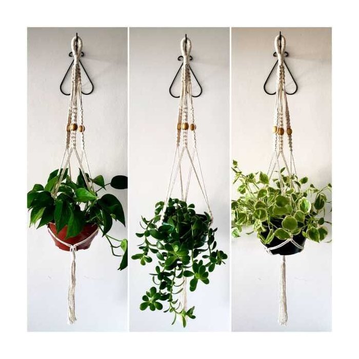 Kit com 3 floreiras em Macramê Hanger, contendo aproximadamente 110 cm de comprimento, detalhes em madeira podendo suportar vasos e cachepot de até 26 cm de diâmetro.