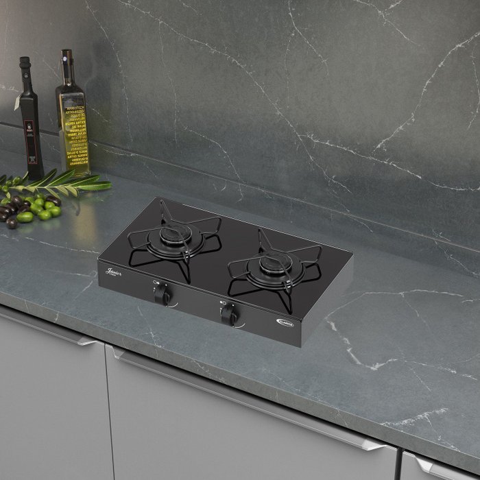 o fogão a gás Junior Glass de duas bocas possui mesa de vidro e acendimento manual, desgin moderno e versátil, entregando um produto portátil que traz facilidade e amor de mãe para os momenos em família.