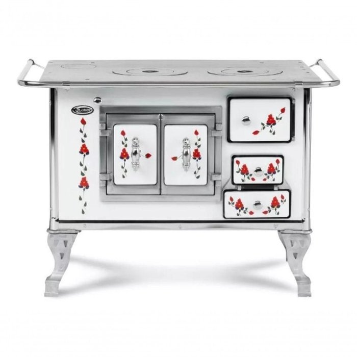 Fogão a Lenha N2 Ferro Fundido Esquerdo Branco Floreio Porta Dupla Branco Floreio