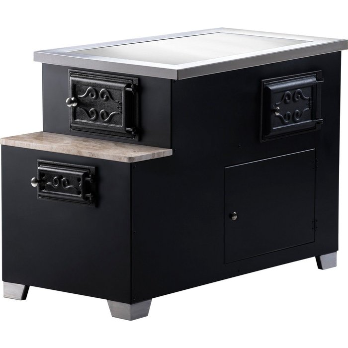 Fogão campeiro em aço carbono com revestimento interno em 4,25mm e refratário, acabamentos e forno em aço inox escovado. O modelo Verona com chapa de 80x45cm é a melhor opção para quem dispõe de pouco espaço e deseja um fogão com grande propagação de calor e que disponha de forno para os assados. O forno e depósito podem ser do lado direito ou esquerdo do fogão e granito Verde Ubatuba ou Bege Bahia.