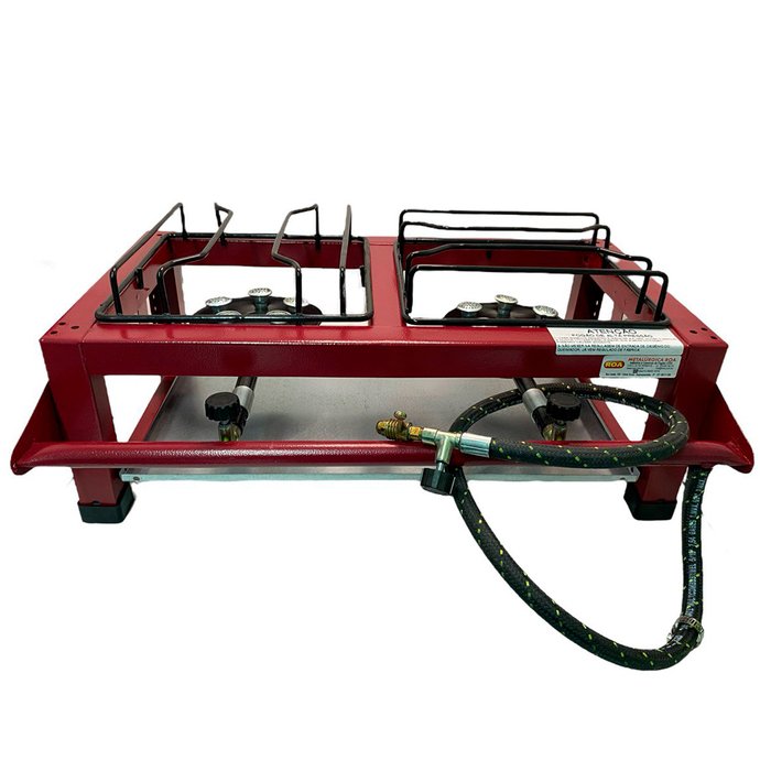 Fogão Industrial 2 Bocas de Bancada Alta Pressão + Registro Grelhas altas pintadas Queimador com 4 caulins Registro Zamak com injetores Tubo de distribuição de gás na cor preta Pés de borracha nitrílica de alta resistência
