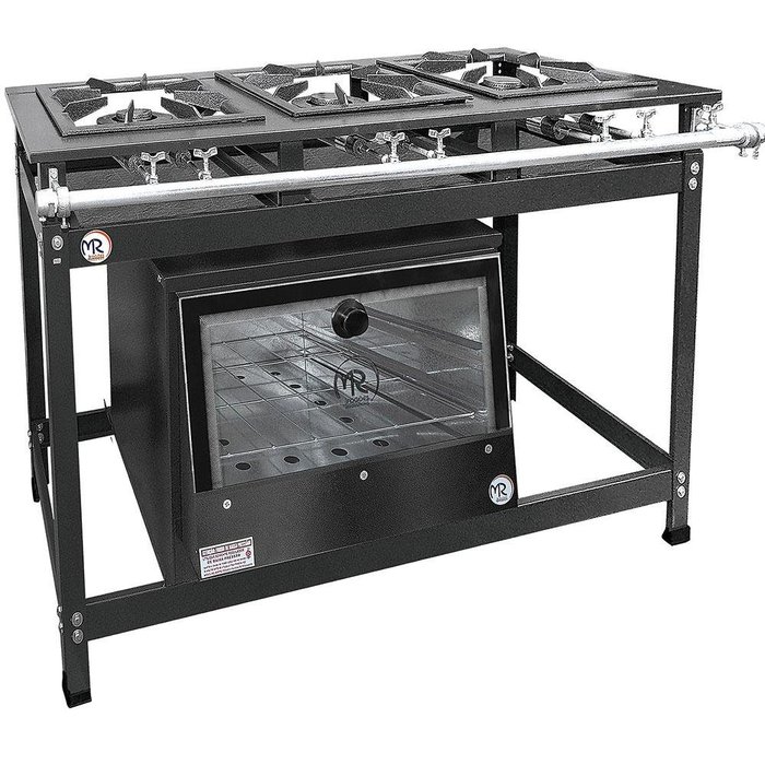 FOGÃO INDUSTRIAL 3 BOCAS A GÁS MR FOGÕES LINHA LUXO P8 O fogão industrial 3 bocas com forno é a ideal para estabelecimentos que necessitam de um equipamento completo e compacto para cozinhar os alimentos, aumentando a eficiência da sua cozinha profissional. Com este fogão a gás você poderá fazer diversas receitas cozidas ou assadas, já que possui um forno de 80 litros com porta de vidro acoplado em sua estrutura. Este fogão profissional possui 3 bocas duplas e uma estrutura reforçada, produzida com vincos e dobras para ganho de resistência e rigidez, sendo fabricada inteiramente em aço carbono com pintura eletrostática epóxi, garantindo muito mais durabilidade