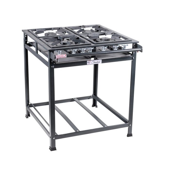 O Fogão dispõe de 2 queimadores simples e 2 duplos podendo ser alimentado por um botijão convencional, sua grelha é no tamanho de 30x30cm com garras de 1cm de espessura, estrutura no perfil de 5cm nas bocas.