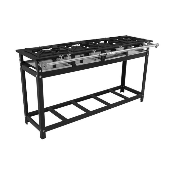 Fogão Industrial 4 Bocas em Linha 30x30 Alta Pressão P7 Lux - MetalFourFogão Industrial 4 Bocas em Linha P7 da MetalFour é indicado para comércios e residências. Muito utilizados em áreas de lazer.O Fogão Industrial em Linha da Metal Four, confeccionado em chapa de aço carbono ponteado e finalizado em solda MIG. O registro regulador é feito em latão niquelado e cromado, fornecendo mais resistência.As grelhas são quadradas, com 30cm x 30cm de dimensão, forjadas em ferro fundido a altas temperaturas, garantindo o alto padrão de dureza.Os pés são de aço carbono com sapatas de borracha antiderrapante. Por fim, a pintura é em epóxi a pó eletrostático na cor cinza grafite, garantindo a qualidade, resistência e durabilidade em altas temperaturas.ALTA PRESSÃO: É um modelo cuja válvula permite que o gás do botijão saia com a mesma pressão diretamente para os reguladores (registros) do fogão, sendo assim, propiciando maior potência calorífica.Conheça melhor o Fogão Industrial 4 Bocas em Linha 30x30 Alta Pressão P7 Lux - MetalFourESPECIFICAÇÕESMaterial da estrutura: Chapa de Aço CarbonoMaterial do Registro Regulador de Gás: Latão Duro Niquelado e CromadoMaterial do Queimador: Ferro Fundido à alta temperaturaMaterial dos Pés: Aço Carbono Desmontáveis e Sapatilhas de Borracha AntiderrapanteGrelha: 30x30 contendo 6 dedos em Ferro FundidoMesa: Perfil 7 (70mm)Pintura: Epóxi - Cinza GrafiteFuncionamento: À GásAcendimento: ManualPressão do Gás: Alta PressãoConsumo: 700gr/hr por queimadorMedidas do Produto MontadoAltura: 80cmLargura: 149cmProfundidade: 45cmPeso: 38KgAcompanhaKit de ligação contendo mangueira com 1 Metro, 2 abraçadeiras + 1 válvula de ALTA PRESSÃO para ligação em botijão P-13 ResidencialGARANTIA3 meses contra defeito de fabricação