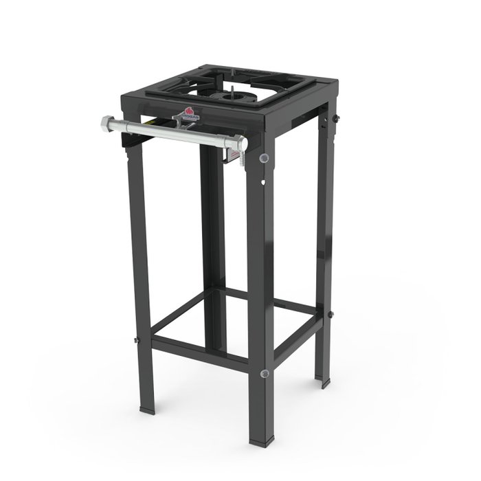 Fogão 1 Queimador C/ Pés; a gás baixa pressão; Aao carbono com pintura epóxi; Fogão de Encosto; Moduláveis e desmontáveis; Produzido com perfl de 5 cm e grelha removível em material fundido de 32 x 32 cm; Registros industriais cromados com estágios contínuos; Com bandeja coletora de gordura e sapatas plásticas; 1 queimador simples chama dupla ø 120 mm.