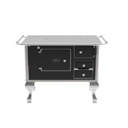 Este fogão a lenha combina eficiência e design sofisticado, ideal para cozinhas residenciais, áreas gourmet e ambientes rústicos. Ele serve tanto para preparar refeições com o autêntico sabor da lenha quanto para aquecer o ambiente. Possui chapa duplamente polida, varão protetor cromado, acabamentos em aço inox, molduras em alumínio polido, porta do forno com abertura horizontal, fornalha com grelha de arame esmaltado e pés em alumínio. Seu design versátil combina com decorações rústicas, modernas ou industriais.