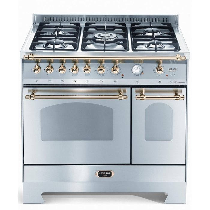 Fogão RSD96MFTE / Ci LOFRA Seu requintado design vintage é formado por puxadores e botões em robusto latão, relógio analógico com 4 funções, porta do forno com vidro em curva, rodapé em aço inox escovado igual ao da mesa e brasão LOFRA em latão maciço. Equipado com avançados recursos de preparo na mesa e nos fornos, um fogão Dolcevita LOFRA fará você reviver deliciosos momentos gastronômicos. Queimadores profissionais Sabaf Série III de alta tecnologia, que inclui a potente chama tripla de 4.000 W, proporcionam calor sob medida para suas grandes aventuras culinárias. Desfrute de assados com resultados profissionais em seu amplo forno ventilado de 72 litros, com 10 funções e 4 zonas de aquecimento em diferentes posições para um calor homogêneo em todas as prateleiras. Versátil, ele prepara pratos doces e salgados juntos sem trocar aromas e sabores, aquece rapidamente dispensando pré aquecimento e oferece temperaturas de 60º C à 250º C para o preparo de todos os tipos de receitas. O forno auxiliar de 34 litros com 4 funções é um versátil aliado para preparar alimentos menores ou reaquecer pratos já preparados. Com os potentes grills infravermelhos com controle de temperatura prepare facilmente deliciosos churrascos, suculentos grelhados e apetitosos gratinados, de forma rápida e divertida. A LOFRA utiliza componentes, matérias primas e processos produtivos com os mais altos padrões de qualidade, que proporcionam a reconhecida longa durabilidade de seus fogões. O aço 304 BA utilizado é considerado o melhor do mundo por sua excepcional resistência à corrosão e manchas, e que recebe escovamento não poroso que facilita sua limpeza. Os fogões LOFRA podem ser utilizados embutidos sem necessidade de frestas de ventilação junto aos móveis, com ou sem os seus pés, para uma perfeita integração com os móveis de sua cozinha. Descubra e relembre com um fogão Dolcevita LOFRA todos os deliciosos sabores da grande arte culinária! Performance 1 Queimador triplo de 4.000 W: ideal para cozimentos ultra rápidos. 4 Queimadores profissionais Sabaf Serie III: performance excepcional sem equivalentes, alta eficiência com baixíssimas emissões. Forno principal: com 72 litros, oferece 10 versáteis funções que tornam mais fácil preparar todos os tipos de alimentos. Forno auxiliar: com 34 litros, tem funcionamento ultra rápido e 4 funções que incluem o grill churrasqueira por infravermelho. Especificações Cor:aço inox escovado. Tensão:220 V Dimensões com embalagem: Peso:80.00 Kg Profundidade:685 mm Altura:997 mm Largura:987 mm Dimensões sem embalagem: Peso:75.00 Kg Profundidade:600 mm Altura:850 a 905 mm Largura:900 mm