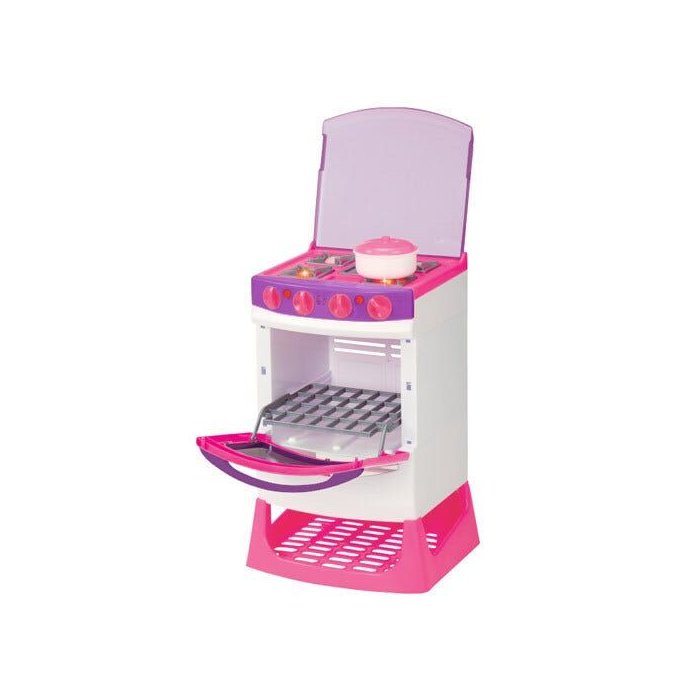 Fogão master chef eletrônico, a tampa do forno abre e fecha, botões automáticos com sons de fritura e fervura, tampa translúcida, sons e luzes. Acompanha: 2 panelas.