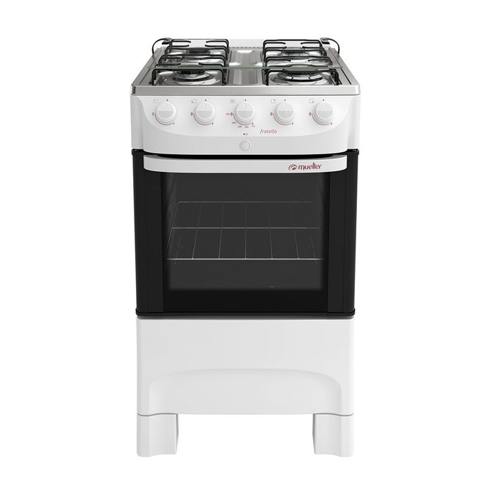 Fogão Mueller Fratello Piso 4 Bocas Branco G6 601230024 BivoltPara os amantes da culinária e que querem criar momentos, impressionar com pratos e trazer carinho e cuidado a sua família a Mueller traz a linha Fratello de Fogões.Com 4 queimadores (1 Família (2000 watts), 3 Médios (1700 watts)) e alta performance, esse fogão deixará sua rotina na cozinha muito mais prático. Além de trazer estilo e um design moderno que renovará e valorizará sua cozinha como nenhum outro.Sua mesa é de Inox polido com acabamento brilhante e grades que proporcionam ainda mais estabilidade as suas panelas. Você poderá fazer receitas para você e toda a sua família não apenas por conta dos queimadores com potências diferentes mas também por conta do seu forno com capacidade de 48 litros.O forno conta com uma prateleira e ilimunação interna e visor panorâmico para trazer maior controle de seus preparos. O revestimento interno total clean faz com que você perca muito menos tempo na hora da limpeza e manutenção do seu forno.Especificações Técnicas:- Marca: Mueller- Linha: Fratello- Modelo: G6 - Referência: 601230024 - Voltagem: Bivolt- Tipo: Fogão de Piso- Tipo de acendimento: Acendimento automático total- Tipo do Gás: GLP (Conversível para GN)- Cor: Branco- Capacidade do Forno: 48 litros- Potência dos Queimadores: 1 Família (2000 watts), 3 Médios (1700 watts)- Potência do Forno: 1900 watts- Classificação Energética: A- Material da Mesa: Inox Polido com Acabamento Brilhante- Acabamento do Interior do Forno: Total Clean- Prateleiras do Forno: Uma prateleira.- Luz no forno: Sim. A lâmpada não acompanha o produto- Dimensões do Produto (LxAxP): 48,5 x 87 x 55 cm- Dimensões da Embalagem (LxAxP): 49,5 x 88,5 x 56 cm - Dimensões internas do forno (LxAxP): 38 x 30,5 x 41 cm- Peso Líquido: 16,8kg- Peso Bruto: 18,1kg- Garantia: 12 meses