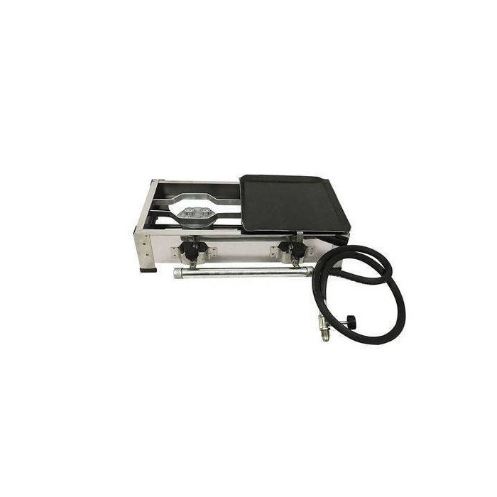 O Fogão Pequeno 2 Bocas Meia Chapa Alta Pressão Inox, um fogão ideal para preparos diversos em sua residência, empresa, condominios e principalmente camping. Equipado com dois registros individuais para controlar chamas, estrutura inteira em inox. Fácil manuseio, fácil transportação. Os fogões Big Grill gastam menos gás e aquece muito mais rápido, equipados com coletores de gordura e proteção nas laterais contra ventos. Além da possibilidade de ser usado como fogão de frituras em geral para grelhar bifes, lanches e etc.
