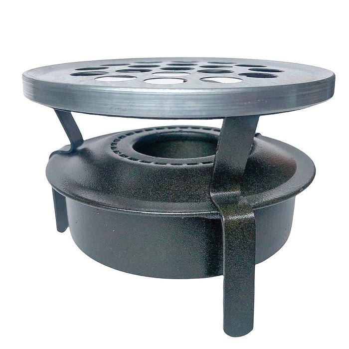 Feito em estrutura de aço, é durável e resistente. Seu formato é similar à boca de fogão, com furos ao redor para facilitar a volatilização do álcool, garantindo uma chama consistente e rápida.