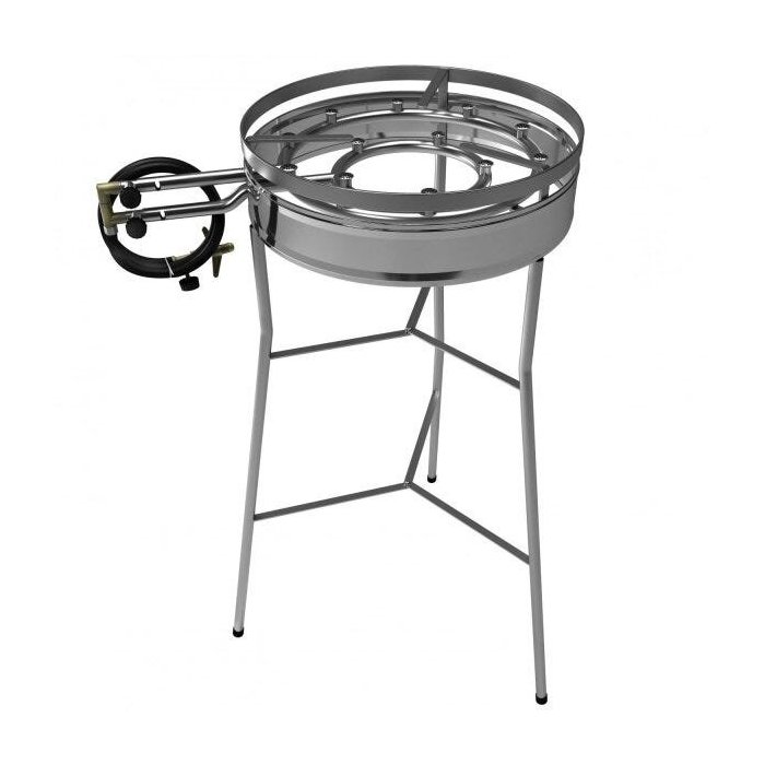 Fogareiro duplo com 15 caulins, possui borda em inox evitando que o vento não atrapalhe o fogo, acompanha pés desmotáveis sendo que o fogareiro pode ser usado sobre mesa ou bancada, possui dois registros e mangueira para alta pressão.