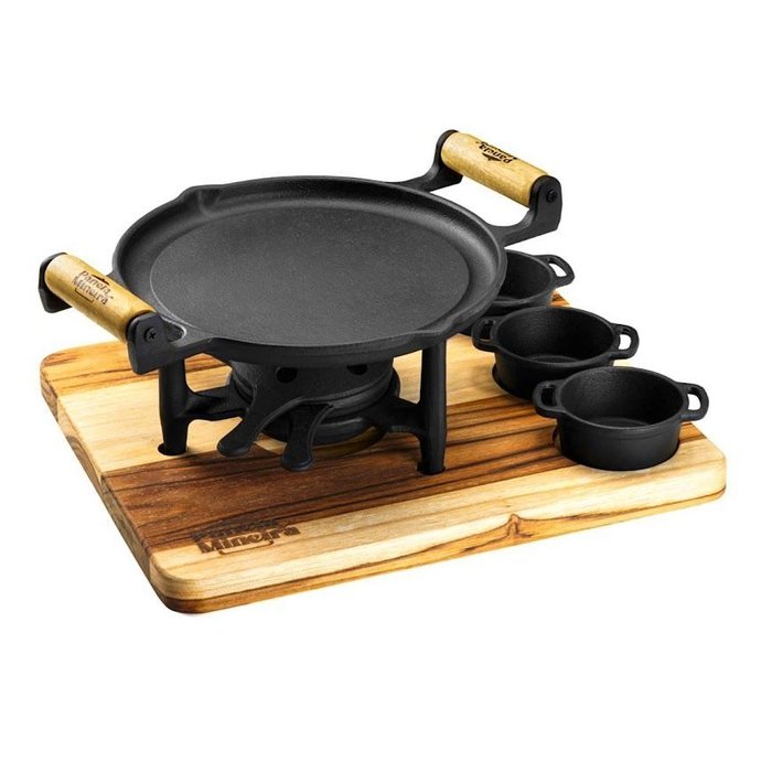 O Conjunto Fogareiro Fogo Forte Alça de Madeira da Panela Mineira é um produto moderno, prático e eficiente, que apresenta alto desempenho no preparo de diversas receitas. Ideal para preparar, fritar, selar e grelhar carnes. Este conjunto exclusivo e patenteado é composto por uma Bifeteira de Ferro Fundido Fogo Forte, 3 molheiras em miniatura e um Fogareiro a álcool. Sua excelente distribuição e retenção de calor, característico do ferro fundido, mantém os alimentos aquecidos por muito mais tempo, além de enaltecer seus sabores e aromas. Muito utilizada por bares e restaurantes para servir porções devido a sua resistência, boa apresentação e por manter-se quente por mais tempo.