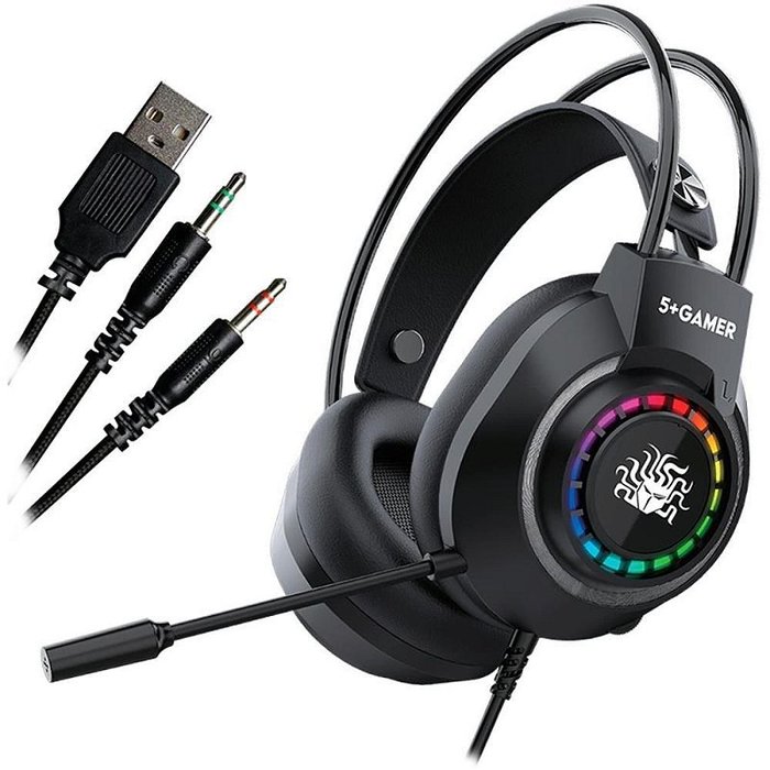 O Fone De Ouvido Com Microfone Headset Gamer Rgb 5+X5-1000 Preto da marca 5+ Gamer e um acessorio essencial para quem busca uma experiencia completa de imersao nos jogos. Com design moderno e elegante, esse headset e equipado com luzes RGB que proporcionam um visual incrivel durante as partidas.