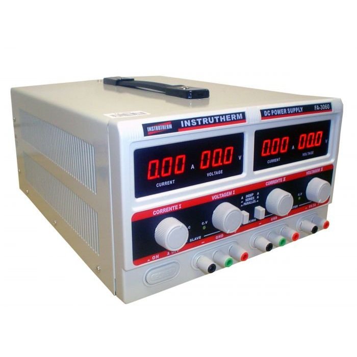 A fonte de alimentação FA-3060 foi especialmente desenvolvida para pesquisas científicas, desenvolvimento de produto, laboratório, universidades e eletrônica. A tensão e a corrente dos 2 canais, podem ser reguladas continuamente dentro do valor nominal: de 0 V ~ 32 V (modo independente) / 0 V ~ 64 V (modo série) e 0 A ~ 6 A (modo independente) / 0 A ~ 12 A (modo paralelo). O instrumento oferece um canal adicional com tensão e corrente fixa de 5 V/3 A e é amplamente utilizado devido a sua alta precisão, durabilidade, proteção de sobrecarga,curto-circuito, inversão de polaridade e modos de operação em independente,série e paralelo.
