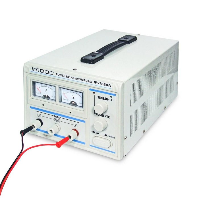 A Fonte de Alimentação Analógica IP-1520A é possui dois indicadores analógicos que indica tensão ( até 15V ) e corrente ( até 20A ) simultaneamente.
