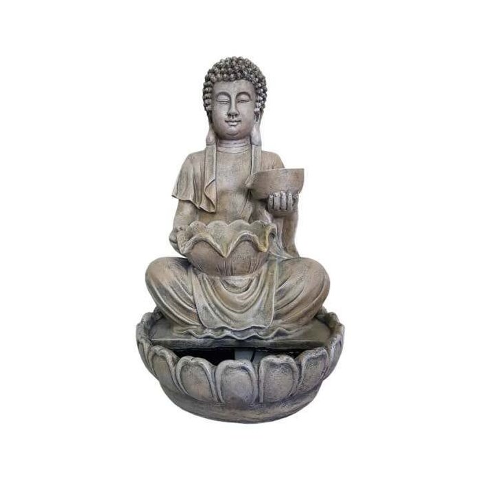 O elemento água representado pela Fonte harmoniza-se com a imagem de Buda meditando purificando os interiores e promovendo equilíbrio. Fonte de água com bacia reforça a serenidade da imagem de Buda .