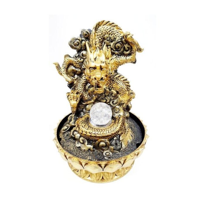 Fonte de água com escultura de Dragão feita em resina, acompanha luz LED RGB e bola de cristal giratória para ser utilizada na saída de água da fonte.