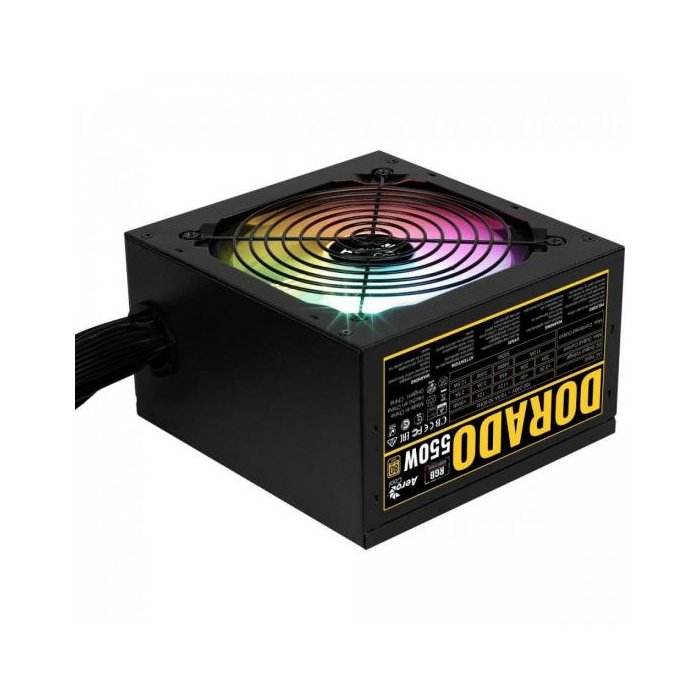 Apresentando um design elegante com um ventilador ARGB embutido de 12 cm, a fonte DORADO aprimora a aparência do setup gamer enquanto alimenta seu sistema com eficiência. Dê vida ao seu sistema com 13 efeitos de iluminação predefinidos que podem ser controlados por meio do botão de controle LED. Compatível com placas-mãe RGB endereçáveis usando conector ARGB. • 80Plus Gold Certified para até 92% + eficiência • Compatível com placas-mãe RGB endereçáveis usando conector ARGB • Circuito de conversão CC a CC para maior eficiência e regulação de tensão rigorosa, mesmo em condições de carregamento cruzado pesado • Capacitores principais japoneses integrados de 105°C fornecem baixa ondulação e maior durabilidade • Os conectores de alimentação de CPU dual permitem compatibilidade com CPUs AMD Ryzen de ponta • Ventilador de alta pressão de 12 cm com velocidade otimizada do permite ruído do ventilador quase inaudível e funcionamento silencioso da fonte • Taxas integradas de APFC (correção de fator de potência ativa)> 0,9Potência:550WPinos:Placa Mãe 1x 20+4Pin+1 / Para processador: 2x 12v + 4 + 4Pin / Para placa de vídeo: 2x PciE 6 + 2P / Conector Pata 3x / Conector Sata: 6xTensão Entrada:100-240Vac 8-4A 47-63HzTensão Saída:+3,3V / +5V / +12V / -12V / +5VSBCorrente:20A / 20A / 45A / 0.3A / 2.5APesquisa:fonte|atx|dorado|plus|550w|aerocool|gamer| - 13 efeitos de iluminação por meio do botão de controle - Circuito de conversão DC para DC - APFC integrado - Fan de alta pressão de 12 cm com controle de velocidade - Oferece potência de saída real em temperaturas ambientes de 40° - Totalmente compatível com EMC - Em conformidade com ErP 2013 Lote 6 para alta eficiência energética - ROHS (restrição de substâncias perigosas) certificado