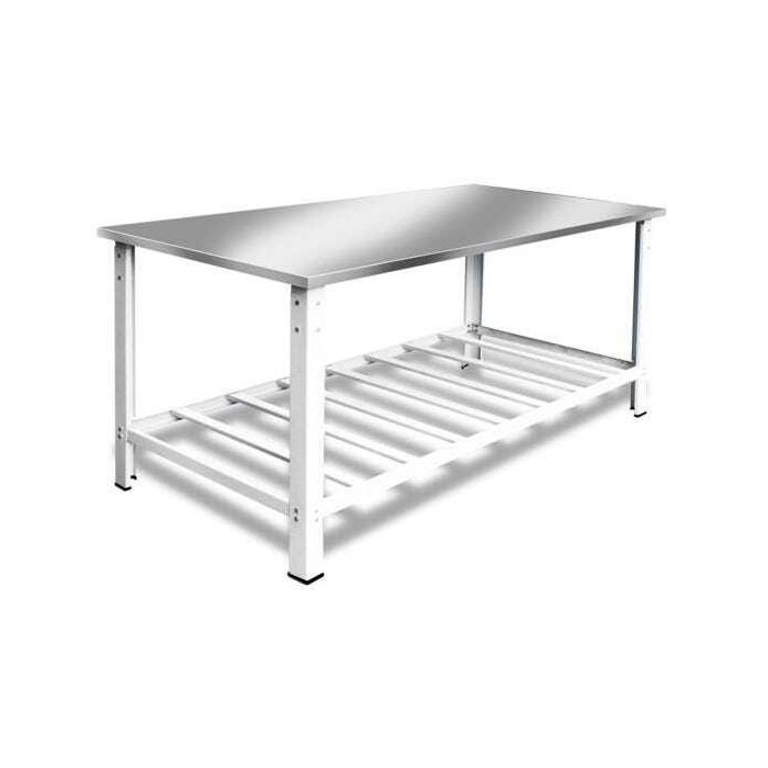 CONTÉM: 4 MESAS 190X90 COM TAMPO INOX 430 E PÉS E PANELEIROS EM AÇO GA PINTADO DE BRANCO 1 FORNO CAVALETE 150 LITROS TAMPA INOX 1 FOGÃO 6 BOCAS 30X30 ECONOMY BAIXA PRESSÃO 16 BANQUETAS COM ENCOSTO ASSENTO COR VERMELHO