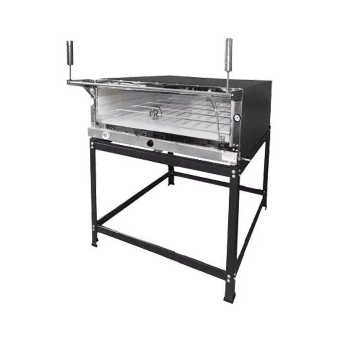 Sua parte externa é fabricada em chapa com pintura epóxi, e interno com chapa galvanizada contém 2 pedras refratárias na base na qual armazena o calor e proporciona maior uniformidade no assado.