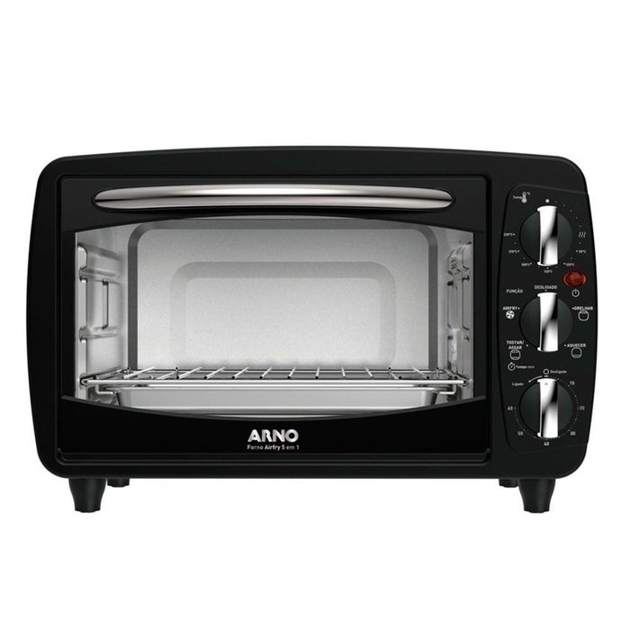 O Forno Arno 5 em 1 oferece inumeras oportunidades na hora de cozinhar em casa, atraves das diferentes funcoes acopladas: Grelhar, Aquecer, Tostar, Assar, e Airfry. Com capacidade total de 20L, oferece tamanho suficiente para fazer um frango inteiro. Acompanha timer de 60 minutos com funcao desligamento automatico, controle de temperatura ajustavel ate 230C, grelha e bandeja removivel para facilitar a limpeza. A tecnologia convencional AirFry permite que o ar quente seja distribuido uniformemente para que tenha alimentos crocantes. O indicador de luz vermelha mostra quando o forno esta ligado.