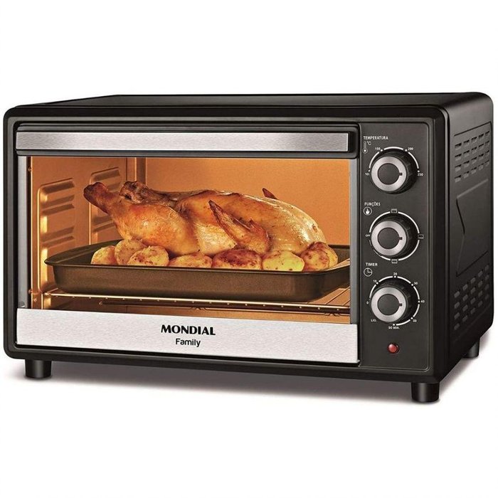 Forno Elétrico Mondial Family 36l Preto/inox 1600w Fr-17 - 220v Com CAPACIDADE DE 36L, o Forno Elétrico Family aquece, cozinha, tosta, assa e grelha. Ele tem AJUSTE DE TEMPERATURA ATÉ 250C, TIMER DE 90 MIN, ALARME E DESLIGAMENTO AUTOMÁTICO, ALÉM DE 1600W DE POTÊNCIA. Este FORNO ELÉTRICO é prático e econômico, DEIXANDO OS ALIMENTOS CROCANTES MAIS RÁPIDO. Suas resistências elétricas inferior e superior têm aquecimentos independentes, e você pode escolher com o botão superior qual resistência ligar. Com ele, você prepara os alimentos no tempo certo. Prepare frango em até 70 min, bisteca em até 90 min, pizza congelada em até 15 min, pão de queijo em até 25 min, lasanha em até 50 min e bolo em até 35 min. Sua GRELHA TEM REGULAGEM DE ALTURA. Já A BANDEJA É REMOVÍVEL para facilitar a limpeza. E seus BOTÕES EM AÇO INOX (INOXIDÁVEL) são extrarresistentes. Aproveite o LIVRO DE RECEITAS para reinventar seu cardápio. CONTEÚDO DA EMBALAGEM: