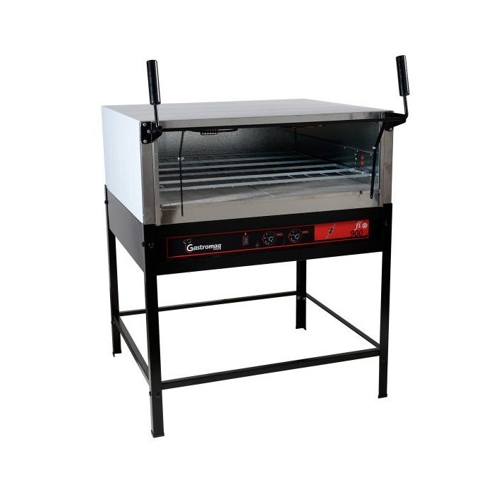 Sistema de abertura da porta tipo guilhotina, controle de temperatura com termostato que possibilita controlar a resistência superior e inferior individualmente.