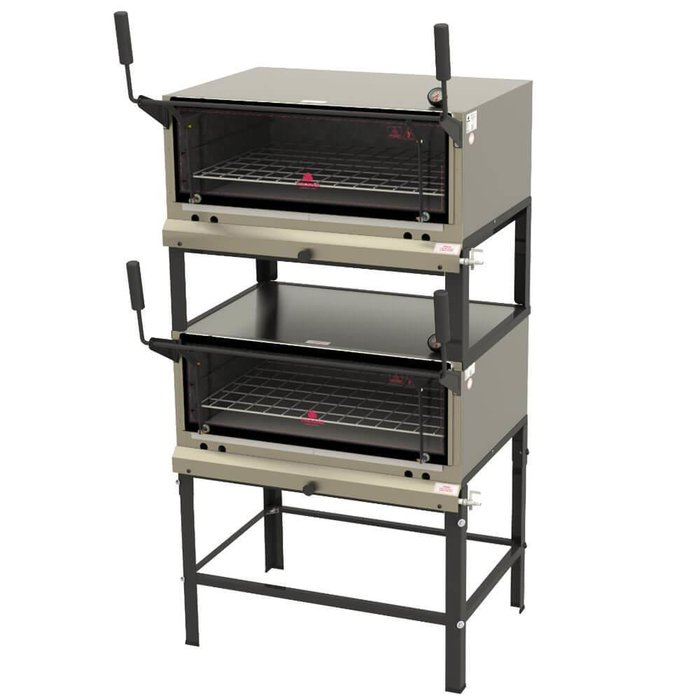 - Com cavalete desmontável, sapatas plásticas, gaveta móvel, placas refratárias, termômetro para controle de temperatura e porta tipo guilhotina;