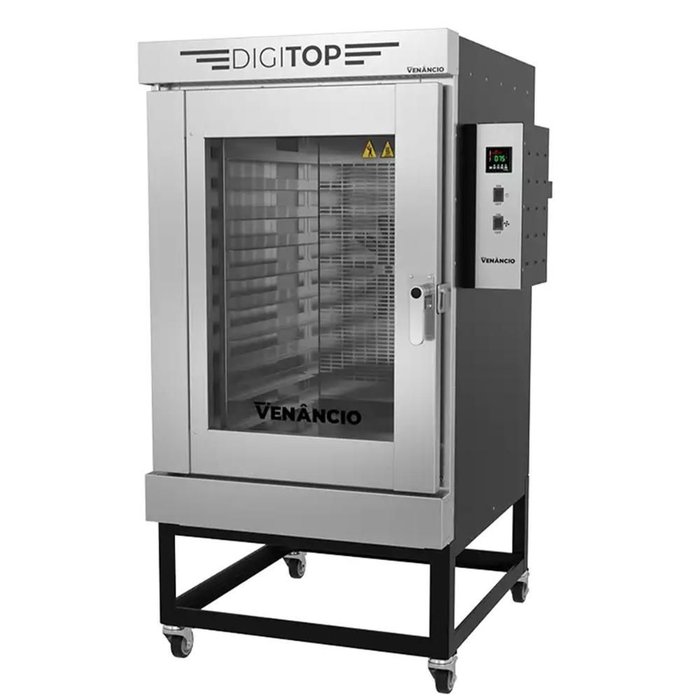 Forno Industrial Turbo Elétrico Venâncio Twister 10 Esteiras Exterior e Interior em Aço Carbono com Cavalete Trifásico 220V FVT10EO Forno Industrial Turbo Elétrico Venâncio Twister FVT10E foi desenvolvido para atender a demandas de grandes cozinhas industriais, padarias e confeitarias. Com 10 esteiras e temperatura máxima de 230°C, proporciona um cozimento rápido e uniforme, adequado para diversos tipos de alimentos. Sua estrutura robusta em aço carbono com pintura pó eletrostática e acabamento em preto garante resistência e durabilidade, enquanto a câmara interna em aço SAE 1020 com tinta para alta temperatura facilita a limpeza e manutenção.A porta do forno é confeccionada em aço inoxidável, com vidro temperado removível, proporcionando praticidade na manutenção. A vedação em borracha de silicone resistente a altas temperaturas assegura eficiência no fechamento da porta sem a necessidade de rebites ou parafusos. O forno também conta com um alarme sonoro e visual, avisando ao usuário sobre o término do processo de cocção, com o controlador emitindo um alerta sonoro e a lâmpada piscando. O suporte para as esteiras, com 580x680 mm, é removível por encaixe, o que facilita a limpeza. O isolamento térmico em lã de rocha e o sistema de adição de vapor ajustável garantem um cozimento ideal, com o tempo padrão de 3 segundos, podendo ser alterado conforme a necessidade. A maçaneta do forno é confeccionada em termoplástico, sendo super resistente e isolante térmico.Equipado com cavalete reforçado em estrutura tubular e 4 rodízios, o forno é fácil de mover e montar. O sensor de temperatura do motor desliga automaticamente o forno caso haja superaquecimento, garantindo maior segurança e eficiência.
