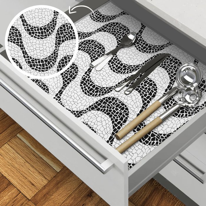 Ideal para prateleiras e gavetas em cozinhas, quartos, closets e etc. Material grosso e resistente em pvc impermeável, com manta de poliéster na parte de trás. Forro discreto e moderno,combina com qualquer ambiente.