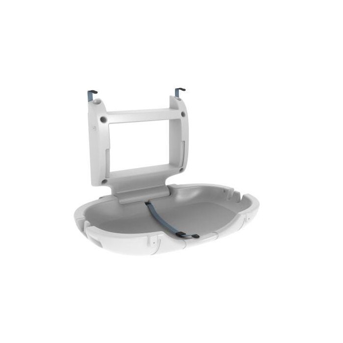 Equipamento basculante para troca de bebês composto por 2 peças para instalação em locais públicos e creches, com ressaltos nas laterais da peça articulada que funcionam como cabide para pendurar bolsas e sacolas. O suporte da parede contém 2 estantes que funcionam como porta-objetos para guardar talco, fraldas, lenços umedecidos, pomadas, etc.