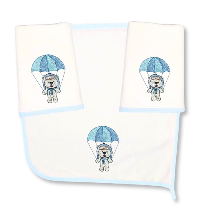 Fraldas de Boca em Malha Ursinho Aventureiro 3 Peças:azul Branco