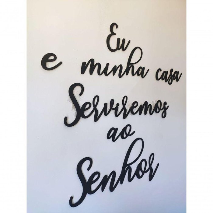 Frase Bíblica Eu E Minha Casa Serviremos Ao Senhor 60cm - Decoração Com Frases Em Mdf Cor Preto Frase Bíblica Eu E Minha Casa Serviremos Ao Senhor. Decore sua casa com esse lindo versículo bíblico "Eu e Minha Casa Serviremos ao Senhor" produzido em MDF 3mm para decoração de ambientes.. Características:Material:MDF.Espessura:3mm.Tamanho: 60cm.Cor: Preto. Instalação: É bem simples, contendo fita dupla face no verso do quadro, sem necessidade de fazer buracos na parede da sua casa.Cuidados e Precauções:Não instalar em ambientes úmidos, externos, paredes texturizadas e não molhar.Limpeza: Apenas um pano seco para tirar o pó. Principais Dúvidas:Essa fita dupla face é mesmo resistente?
