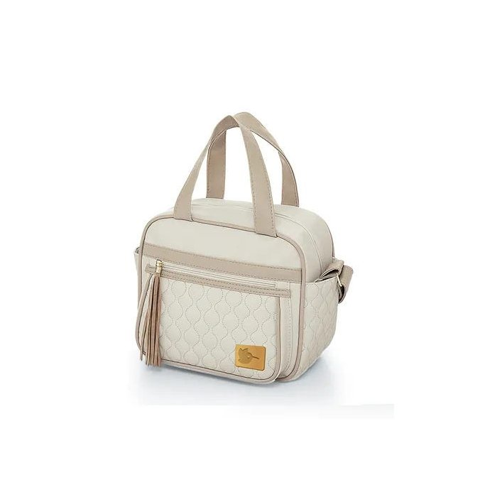 Térmica, Matelassada, Bicolor, Alça de mão, Alça tiracolo regulável, Bolso frontal com zíper, Bolso lateral, Bolso interno, Placa e Puxadores em metal.