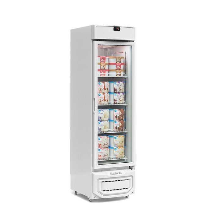 Freezer Expositor Conservador Vertical com Porta de Vidro 315L GLDF315LP Gelopar. Conservação e exposição de sorvetes e produtos congelados. Refrigeração: Ar forçado com evaporador aletado. Temperatura: -18° a -22°C. Degelo: Automático (Frost Free). Controlador eletrônico com indicador de temperatura. Revestimento Interno: Aço pré-pintado. Revestimento Externo: Aço pré-pintado. 1 barra de LED no painel externo. 1 interna. Porta de vidro duplo temperado baixo emissvio, com aquecimento e fechamento automático. Prateleiras aramadas: 3 níveis reguláveis e inclináveis + estrado. Gabinete com rodízios e travas. Vidros sujeitos a condensação da umidade do ar. CAPACIDADE: 315L. CONSUMO: 12,5 kWh/dia. TEMPERATURA: -18°C a -22ºC. PESO: 91Kg. DIMENSÕES EXTERNAS (CxAxL): 53,5x194,7x65,5cm. Equipamento certificado conforme Portaria Inmetro nº 371/2009. Freezer Expositor Conservador Vertical com Porta de Vidro 315L GLDF315LP Gelopar é na Atau.