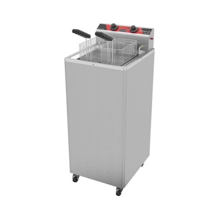 O Fritador Elétrico Zona Fria de Água modelo Pedestal é fabricado externamente em aço inox AISI 430 escovado e tanque em aço inox AISI 304. Esse Fritador acompanha 2 cestos pequenos e 1 cesto grande, fabricados em tela aramada e termostato para controle de temperatura e segurança.