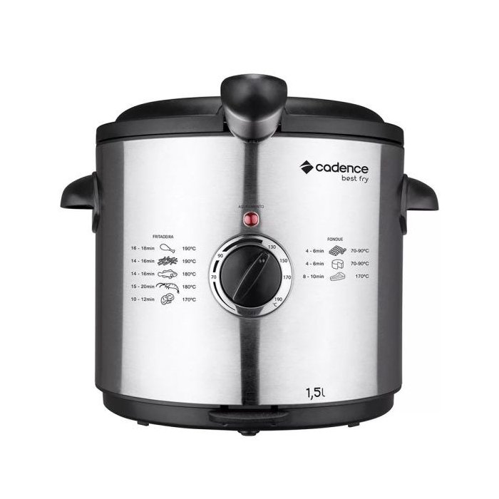 Panela interna removível e com revestimento esmaltado. Maior facilidade de limpeza. Controle de temperatura. Abertura automática da tampa. Tampa com janela de vidro. Capacidade 1,5l de óleo. Atinge 190ºc Voltagem: 127V Dimensões [LxAxP]: 235x230x235mm Peso: 2,5Kg A Fritadeira Best Fry Cadence é ótima para fritar alimentos diversos com grande eficiência e na temperatura certa. Com ela você frita rapidamente batatas, nuggets, frango, empanados, carnes, pastéis, peixe e até prepara um delicioso fondue. Tem prática panela interna removível e antiaderente, que evita o acúmulo de gordura e permite uma limpeza profunda. É também muito prática: você pode regular a temperatura de 130 a 190ºC, permitindo maior controle sobre a fritura. Tem capacidade de 1,5 litros de óleo. Possui botão para abertura automática da tampa, pés antiderrapantes, indicador luminoso de aquecimento e cesto removível em aço inox, com alça externa que evita a exposição ao óleo quente. Sua tampa é removível e tem visor transparente para você acompanhar melhor o processo de preparo. Cesto de aço inox Manual de instruções