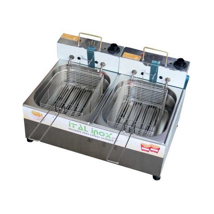 Desenvolvida em aço inox 430, com o termostato na parte superior lhe fornecendo total proteção e temperatura de até 200 graus com capacidade máxima de 10 litros de óleo dividida em duas cubas.