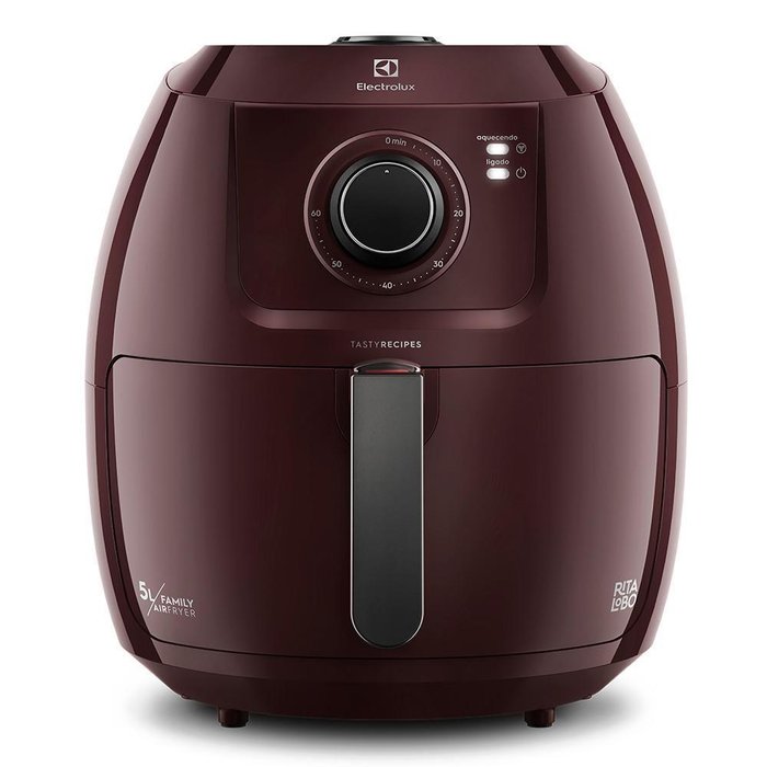 Além da praticidade ao cozinhar, ela reduz quase 50% das calorias e até 90% das gorduras de suas preparações, além de possibilitar que você deixe de descartar até 24L de óleo por ano, contribuindo com a sustentabilidade.As 8 receitas pré-sugeridas no painel indicam tempo e temperatura de preparo. Faça pratos conhecidos, como pão de queijo, legumes, frango, e outros, com a certeza de um resultado delicioso e na quantidade ideal para toda a família. O cesto interno é removível e possui dupla camada de revestimento antiaderente, oferecendo maior durabilidade e facilidade de limpeza. Além disso, a cuba e o cesto são compatíveis com lava-louças.Ideal para o dia a dia, a AirFryer Electrolux Family Efficient por Rita Lobo é equipada com Timer de até 60 minutos. Passado o tempo de preparo selecionado, o produto desliga automaticamente, evitando que os alimentos passem do tempo de cozimento desejado para que alcancem o ponto certo. Intuitiva, a AirFryer de 5L oferece um seletor de temperatura com variação de 80°C a 200°C, assim você pode escolher a opção ideal para diversos preparos.Especificações Técnicas: